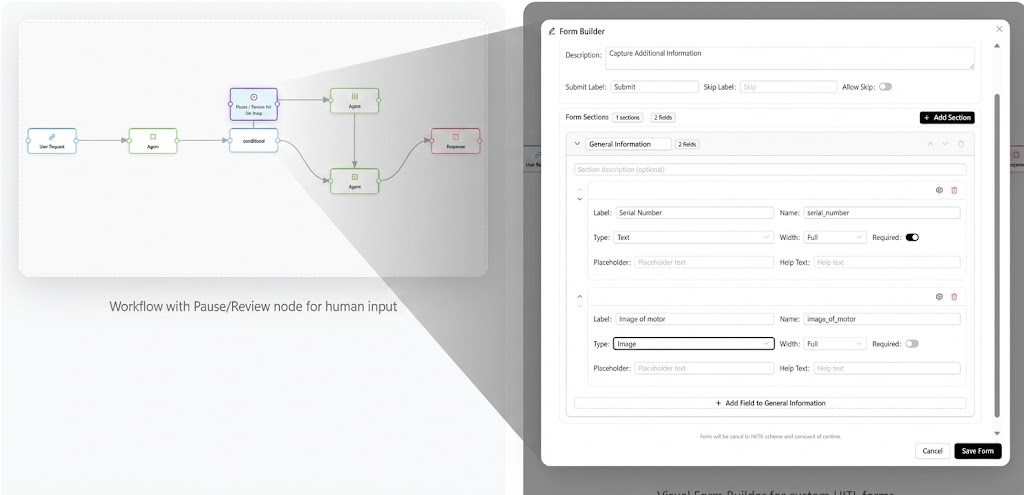 Pause workflows for human review with dynamic form collection. 32 form components let you capture any data your process needs.
